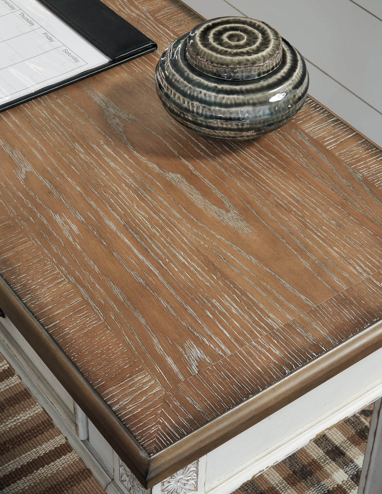 Elevating the art of traditional cottage styling, this desk is your heavenly home office realized. Its antiqued two-tone aesthetic blends a chipped white with a distressed wood tone top for added charm. Framed drawer fronts, decorative corbels and elegantly turned and tapered legs add refinement, while dark bronze-tone knobs lend a classic touch.