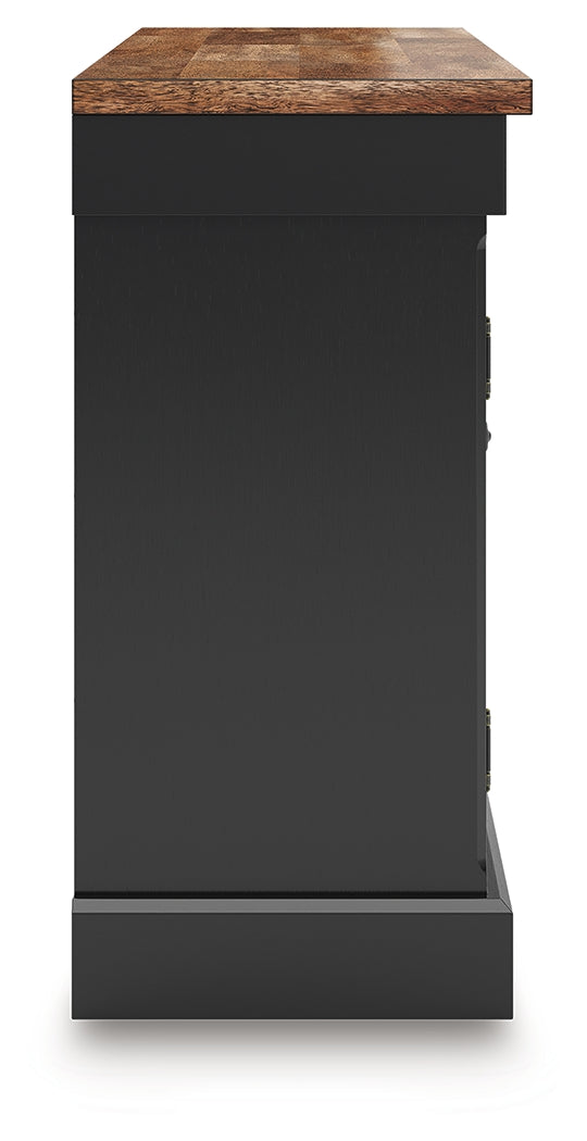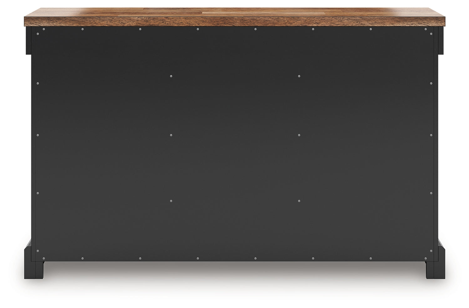 Raise the bar on modern farmhouse style with this dining buffet. Its handsome good looks are accentuated with a two-tone finish and a casual butcher block veneer top. The sturdy silhouette adds a hearty element, whether your style is vintage, country or eclectic. Three drawers and three cabinets with adjustable shelves serve your entertaining needs well.