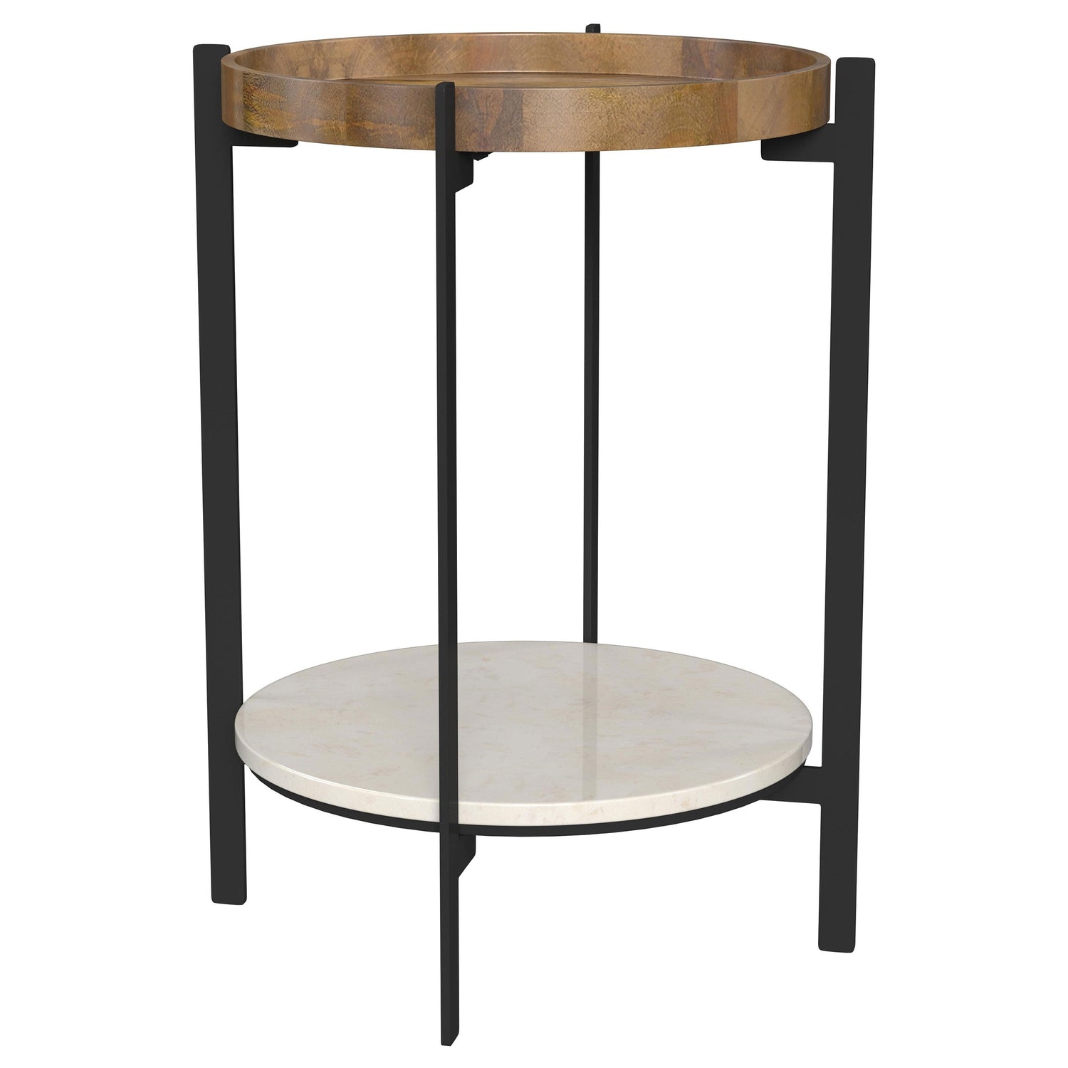 Complete your living space with a side table that combines organic materials and sleek modern lines with effortless charm. The round mango wood top showcases natural grain variation, while a white marble shelf below adds contrast and practical display space. Slender black iron legs support the design with a light, open feel that works beautifully beside a sofa or chair.