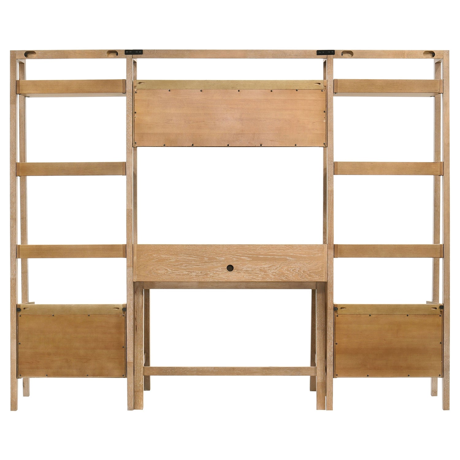 Four-piece computer desk and bookshelf set shapes a calm work zone, framing the center with tall shelving and an overhead bridge that keeps the wall feeling finished. Distressed light brown tones soften the scene as oak veneer grain catches the day’s changing light. Crafted from engineered wood with rubberwood supports, the system stays composed while offering open display space, cubby storage, and drawer areas for daily essentials. Set it up where focus matters, and let everything have a place without crowding the room.
