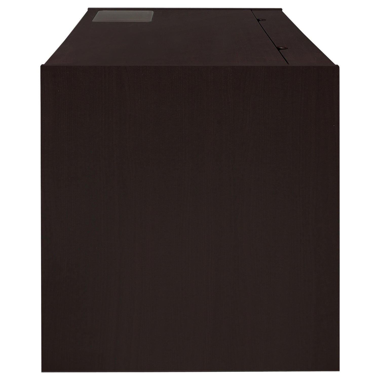 A modular design scheme gives this computer desk its easy balance of function and personality. Finished in bold cappuccino, it brings a contemporary presence to a task space while offering thoughtful organization through three storage drawers and a center keyboard tray. A clear tempered glass insert keeps devices visible on the work surface, and the built-in power compartment adds convenient connectivity. Clean lines and silver hardware complete the look with crisp modern appeal.