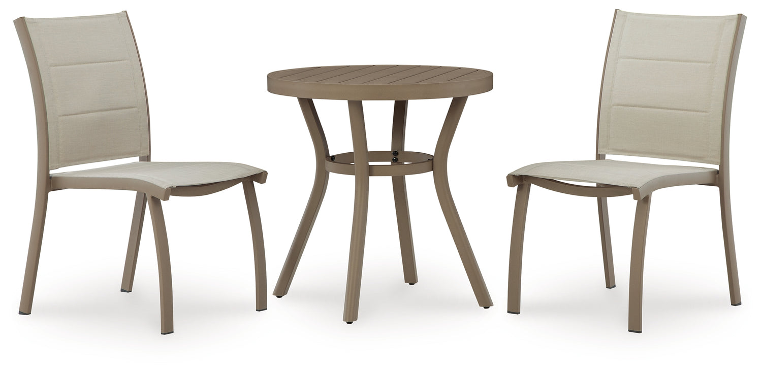 Craft a chic outdoor seating area with this table and chair set. Outfitted in contemporary neutral hues, it's an ideal spot for sipping drinks poolside or relaxing on the porch. Sturdy aluminum construction and sling seating round out the set with both durability and comfort.