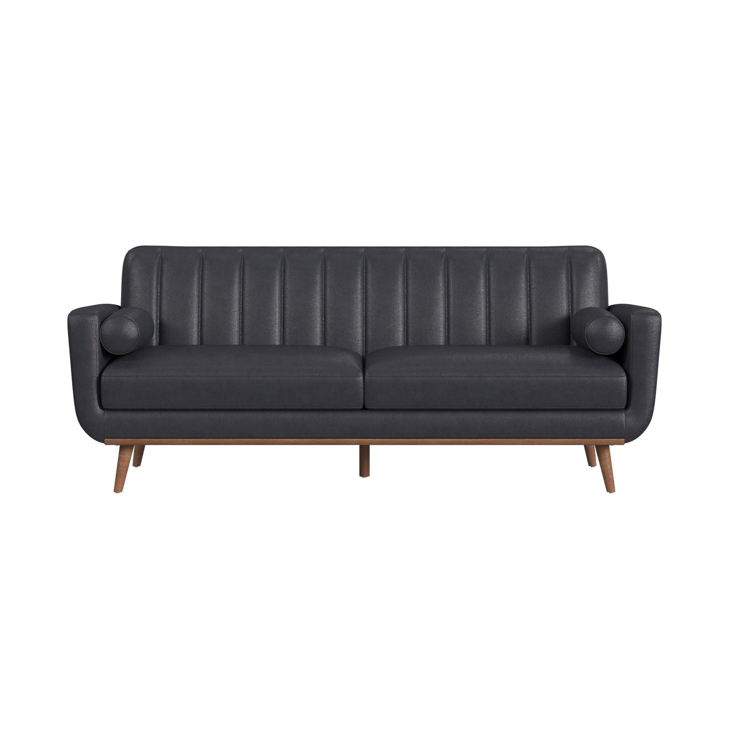 The Horizon Sofa with Wood Front and 2 Six Inch Bolster Pillows exudes the coveted charm of mid-century modern style. Built with a frame fully upholstered in quality faux leather, this piece is built for durability. Comfortable foam cushioning, decorative tufting on the backrest, and track arms forming sleek and modern lines culminate to mark thoughtful design, while an exposed front rail and wood legs highlight excellent craftsmanship. For a refined and sleek addition to your living space, the Horizon Sofa with Wood Front delivers in quality and style.
