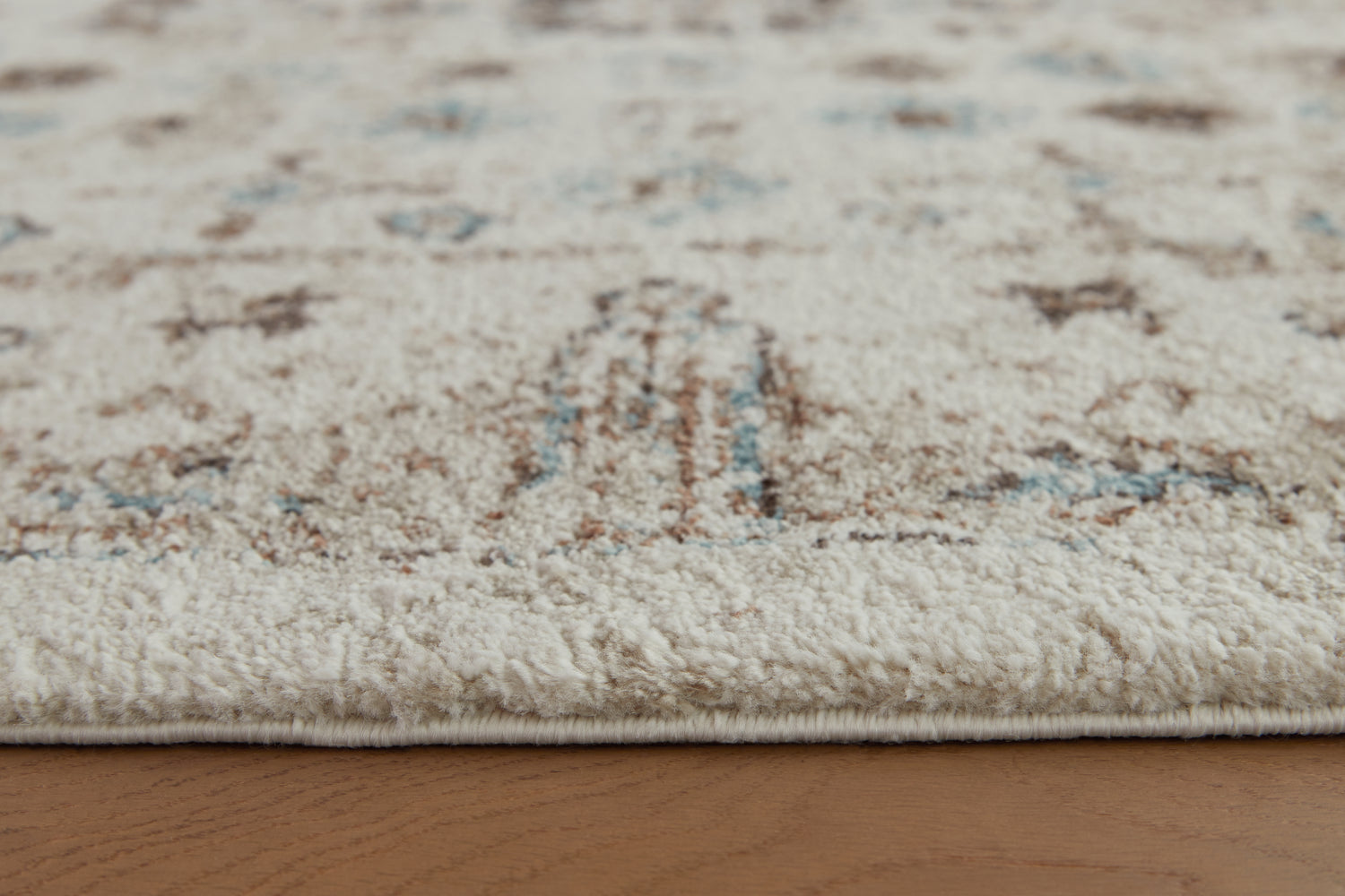 An on-trend take on traditional stylings, this rug brings a pop of pattern underfoot. Simply soothing shades of ivory, brown and teal complement so many settings and color schemes. It’s an inviting addition to your home accents.