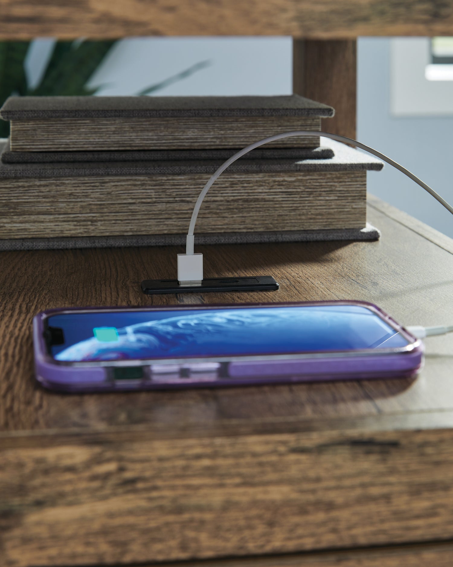 Embrace simply stylish sofa-side function with this chairside end table. Keep entertainment essentials like remotes, coasters and more close with the handy storage cabinet. Battery running low? Built-in USB ports keep easy charging at your fingertips. And with the table's two-tone look in gray and antiqued white, it has the versatility to pair with aesthetics from casual to farmhouse.