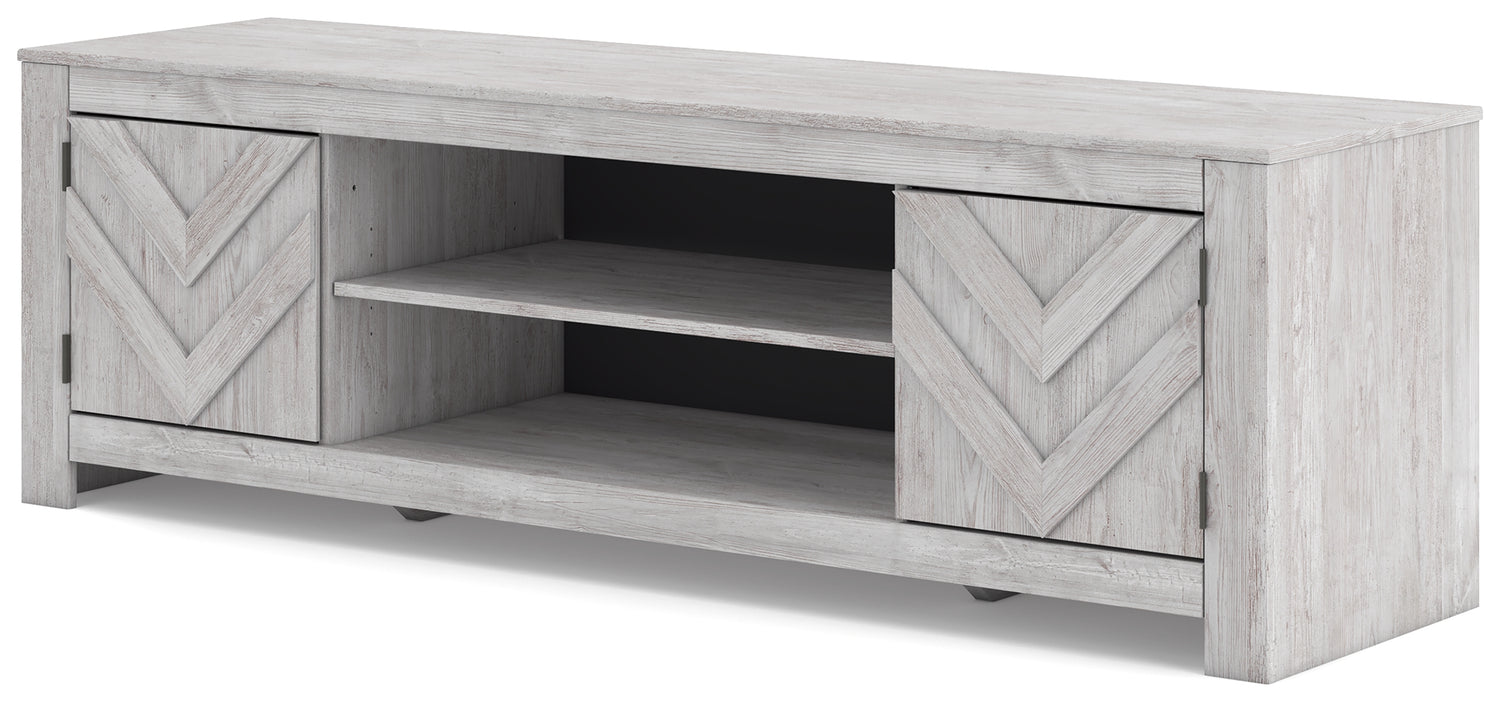 This TV stand embraces a classically charming aesthetic and repurposes it for modern living. Its light replicated wood grain appeals to your love of vintage character, while the chic chevron pattern is effortlessly on trend. And with hidden storage behind the doors, your media accessories stay tucked away in style.