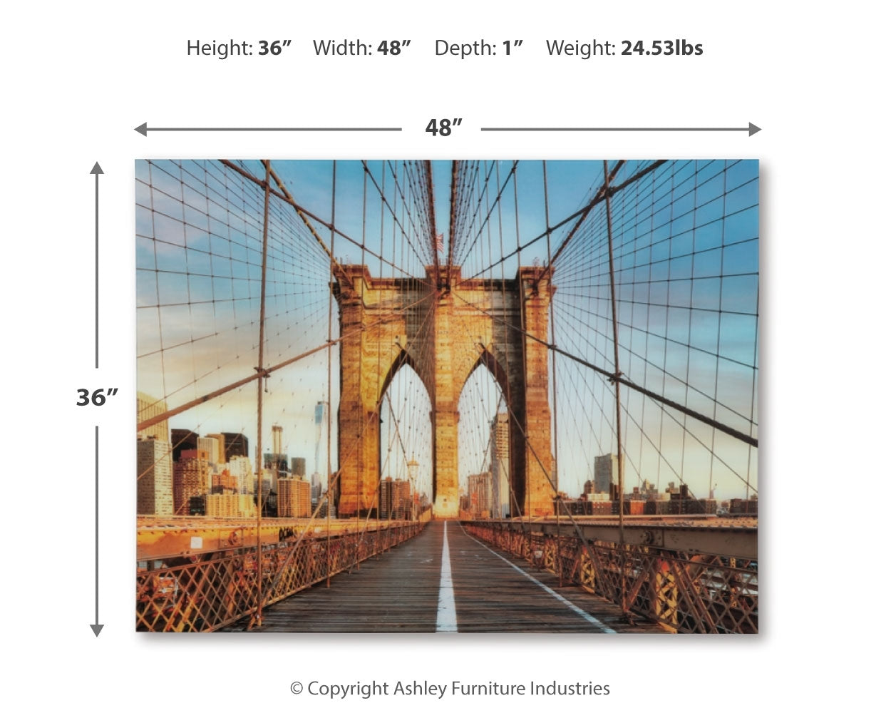 Bring a touch of iconic architecture to your home with this wall art. Captured in beautiful detail, the print on glass showcases the Brooklyn Bridge's majestic arches and intricate cables, set against the backdrop of a vibrant city skyline. This captivating scene is sure to transport you to the heart of New York City every time you look at it.