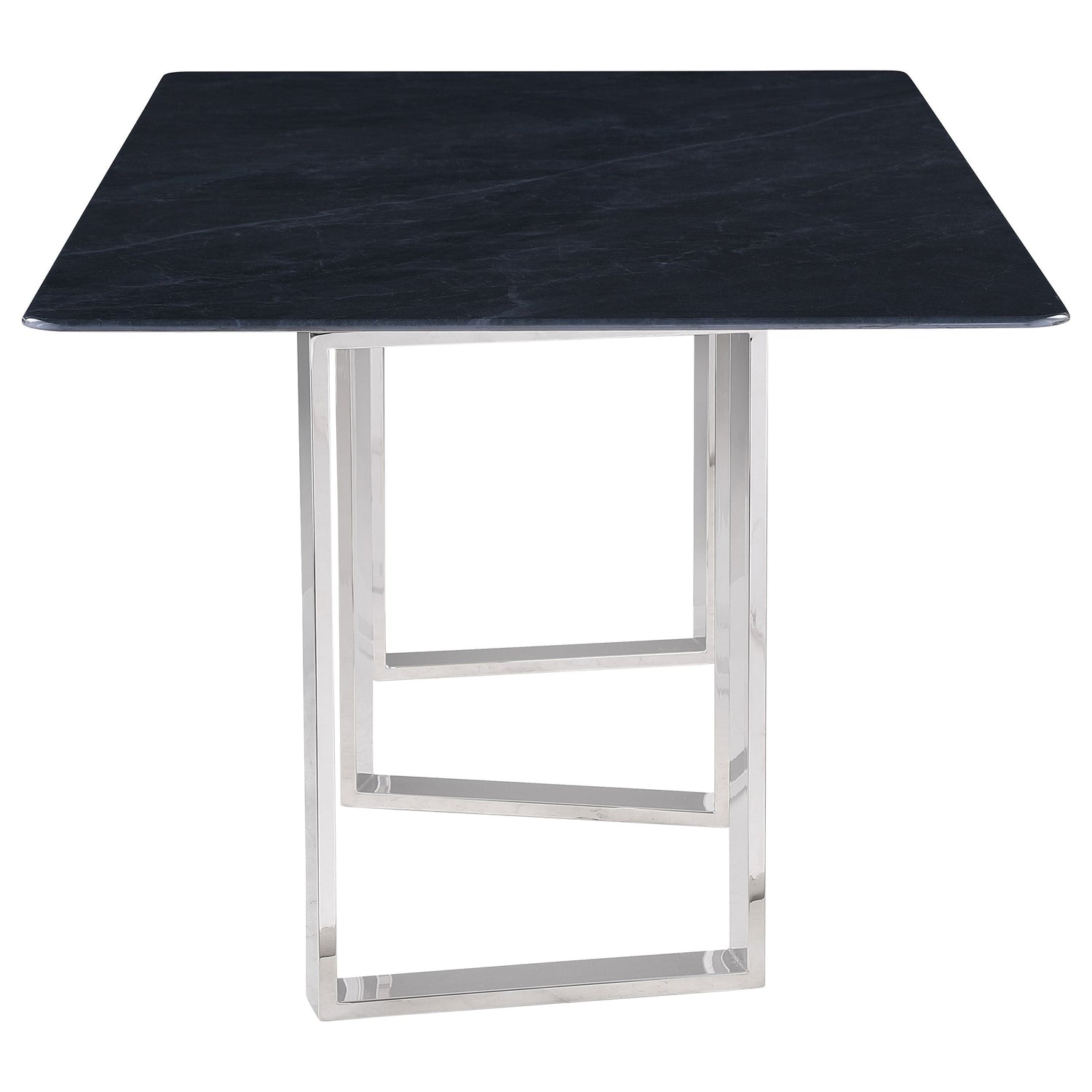 A sintered stone top with a grey marble look gives this dining table an effortlessly sophisticated presence, while its slim silhouette keeps the room feeling open and modern. Three polished stainless steel legs angle beneath the top in a sculptural arrangement that adds movement and dimension from every view. Rounded corners soften the long rectangular form, creating a table that feels refined, airy, and unmistakably contemporary.