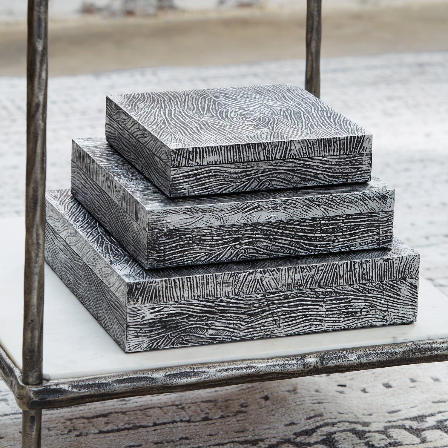 Ideal for a dresser, chest or accent table, this set of three wood and metal boxes is a contemporary choice for the forward-thinking modernist. The antiqued pewter-tone finish is an inspired touch.