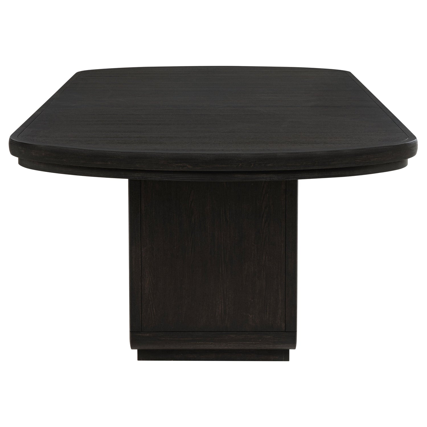 • Dining set includes rectangular table with pedestal base and removable leaf extension